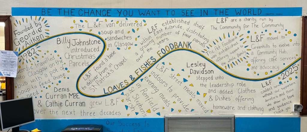 Lesley has lived in East Kilbride all of her life and lives with her family of six and her three dogs! She has been involved in community groups and projects all of her life, including youth group leader, Volunteer Co-Ordinater, Project Co-Ordinator, Company Director and now Chair and Co-Ordinator of Loaves and Fishes Food Bank!